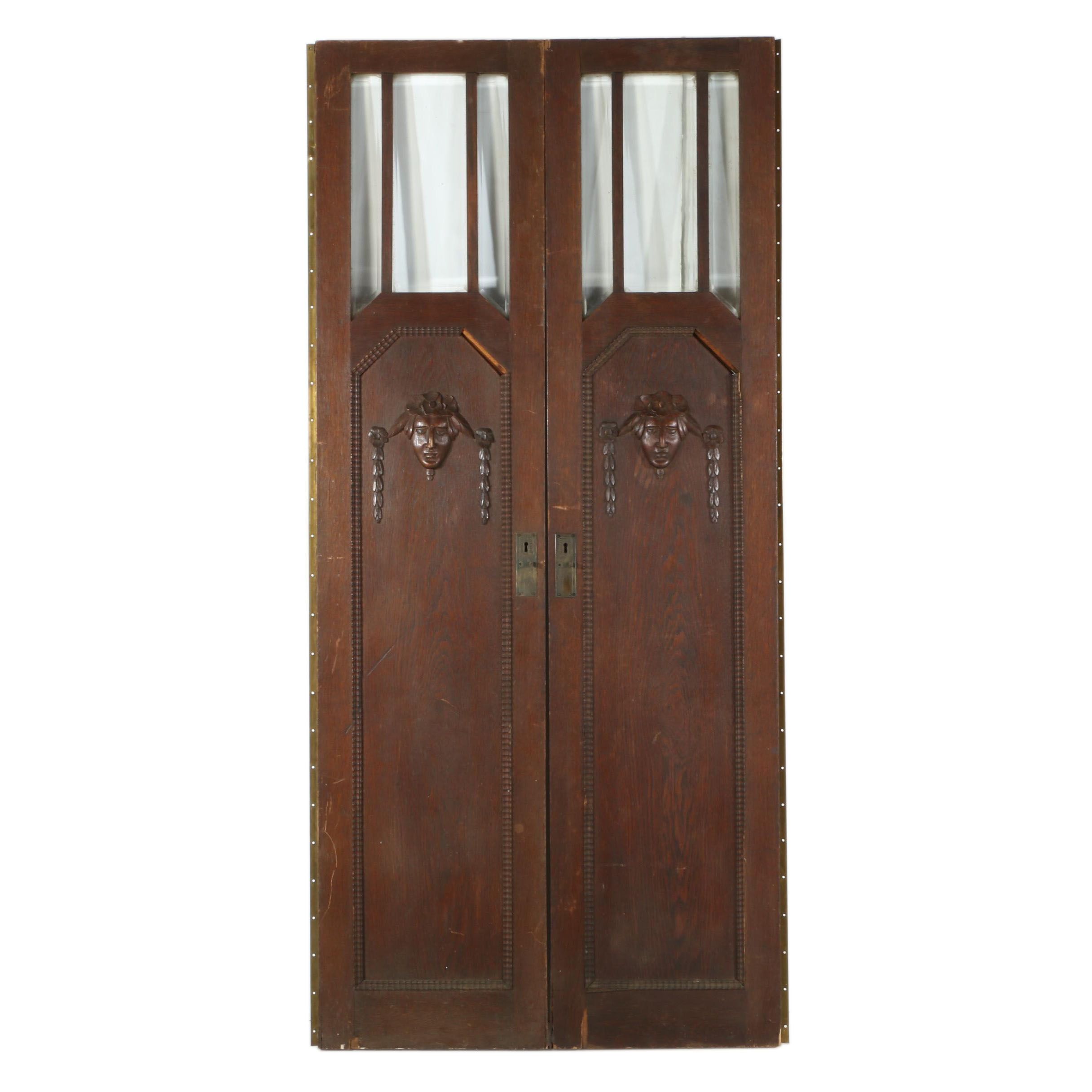 Medium tone wooden cabinet doors with glass panels and original octagon glass pulls.